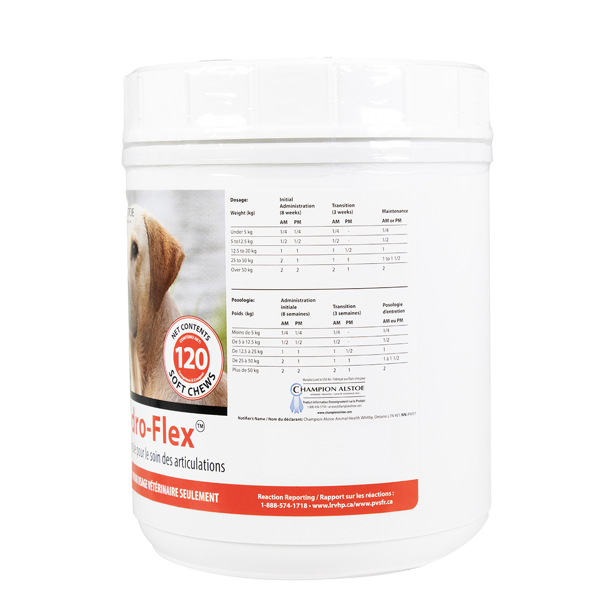 Nutritional supplement for dogs. Chondro-flex soft chews contain high levels of glucosamine and chondroitin for chondroprotection and natural renewal of cartilage; along with MSM which is a source of bio-available sulphur. In addition, Manganese Ascorbate is added to act as an anti-oxidant and neutralizes free radicals. Each soft chew contains: Glucosamine Hydrochloride 500mg, Sodium Chondroitin sulphate 400mg, MSM 500mg, Ascorbate (as Manganese ascorbate) 66mg, Manganese (as Manganese ascorbate) 10mg in a meat flavored, soft textured base.