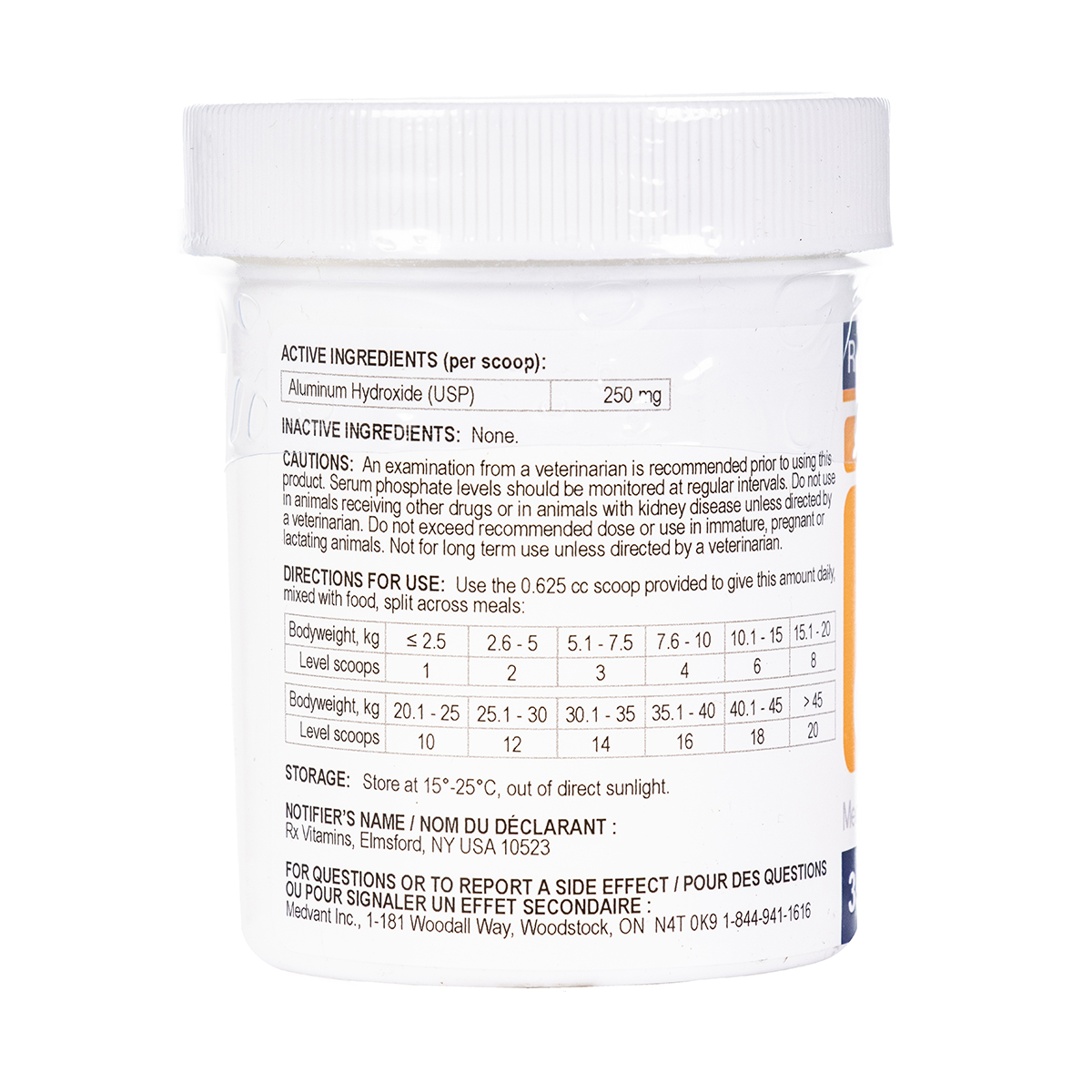 A tasteless, odorless, finely granulated source of pure aluminum hydroxide that complexes with dietary phosphorus in the bowel to support normal kidney function in dogs and cats.