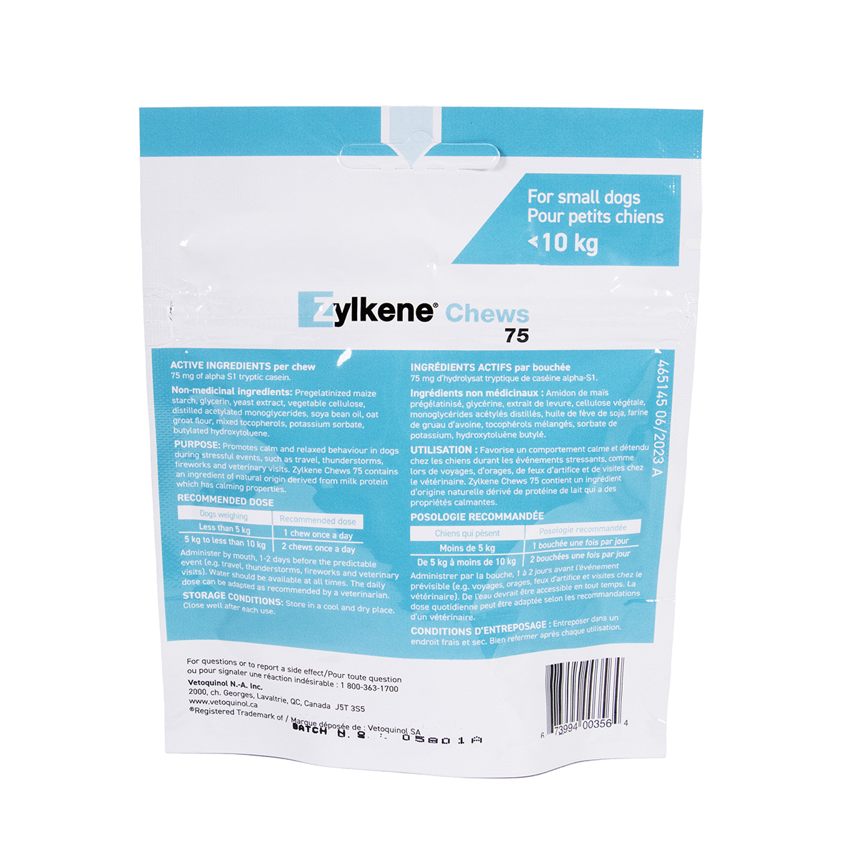 Promotes calm and relaxed behaviour in dogs during stressful events, such as travel, thunderstorms, fireworks and veterinary visits. Zylkene Chews 75 contains an ingredient of natural origin derived from milk protein which has calming properties.