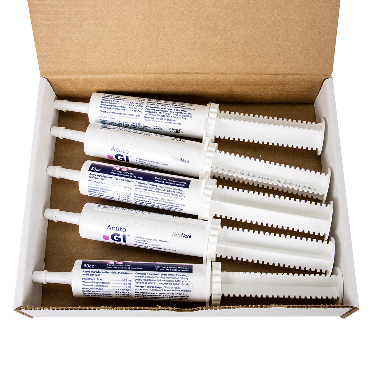 Includes mannan oligosaccharides, probiotics and digestive enzymes to help promote a healthy gastrointestinal tract environment in dogs and cats. Administered using a convenient dial-a-dose syringe. Each pack contains 5 syringes.