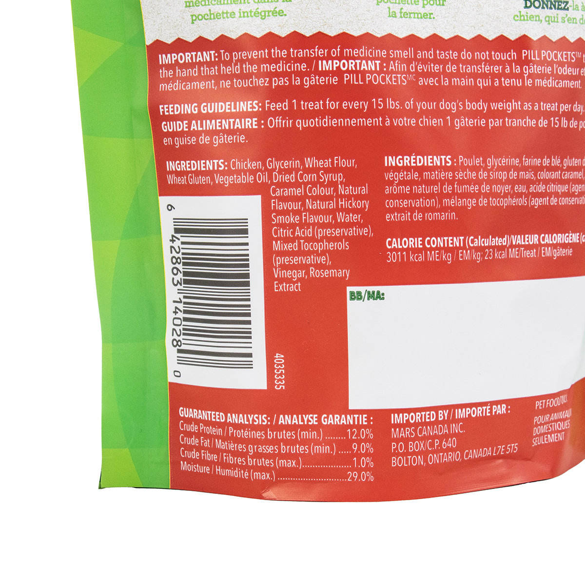 Even the least picky dogs seem to sense medicine tablets from miles away. Give your pet GREENIES™ PILL POCKETS™ Treats for Dogs and skip all of the mess and stress. Once your dog smells the savory hickory smoke flavor of this delicious, low-calorie treat, they won't think twice about taking their meds. They'll be happy and feel rewarded, while you'll get to enjoy the reward of a satisfied pup. Ingredients: Chicken, Glycerin, Wheat Flour, Wheat Gluten, Vegetable Oil, Dried Corn Syrup, Caramel Color, Natural Flavor, Natural Hickory Smoke Flavor, Water, Citric Acid (preservative), Mixed Tocopherols (preservative), Vinegar, Rosemary Extract GUARANTEED ANALYSIS: Crude Protein (Min.) 11.00% Crude Fat (Min.) 10.00% Crude Fiber (Max.) 1.00% Moisture (Max.) 31.00%