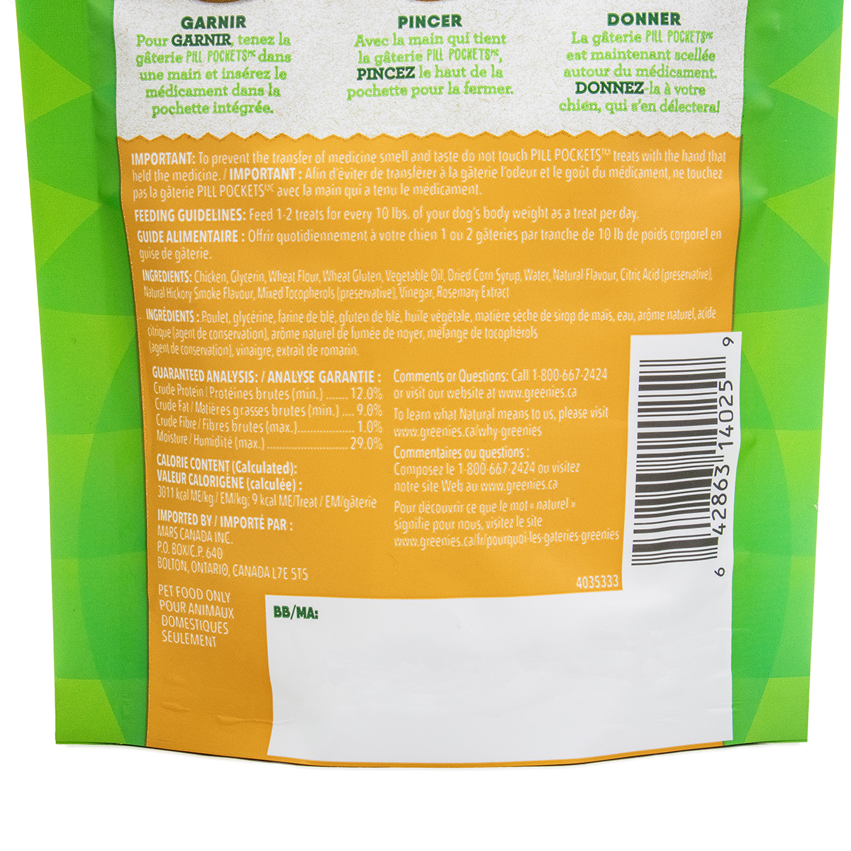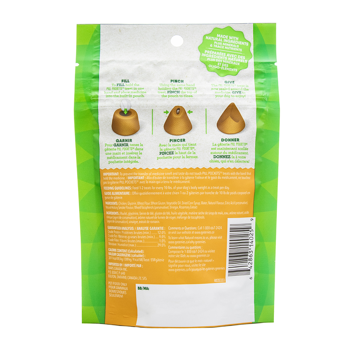 Pets are smart about avoiding their meds, but you're smarter. Designed and recommended by vets, GREENIES™ PILL POCKETS™ Treats for Dogs make it easy to give your dog medicine. Don't hide medicine in human foods, such as peanut butter or cheese. Give a healthy, low-calorie dog treat instead. GREENIES™ PILL POCKETS™ Treats take the stress and mess out of administering capsules or liquid medication to your dog. These easy-to-use pouches mask the smell and taste of medicine and deliver a delicious chicken flavor your dog will love. Ingredients: Chicken, Glycerin, Wheat Flour, Wheat Gluten, Vegetable Oil, Dried Corn Syrup, Water, Natural Flavor, Citric Acid (preservative), Natural Hickory Smoke Flavor, Mixed Tocopherols (preservative), Vinegar, Rosemary Extract GUARANTEEED ANALYSIS: Crude Protein (Min.) 11.00% Crude Fat (Min.) 10.00% Crude Fiber (Max.) 1.00% Moisture (Max.) 31.00%