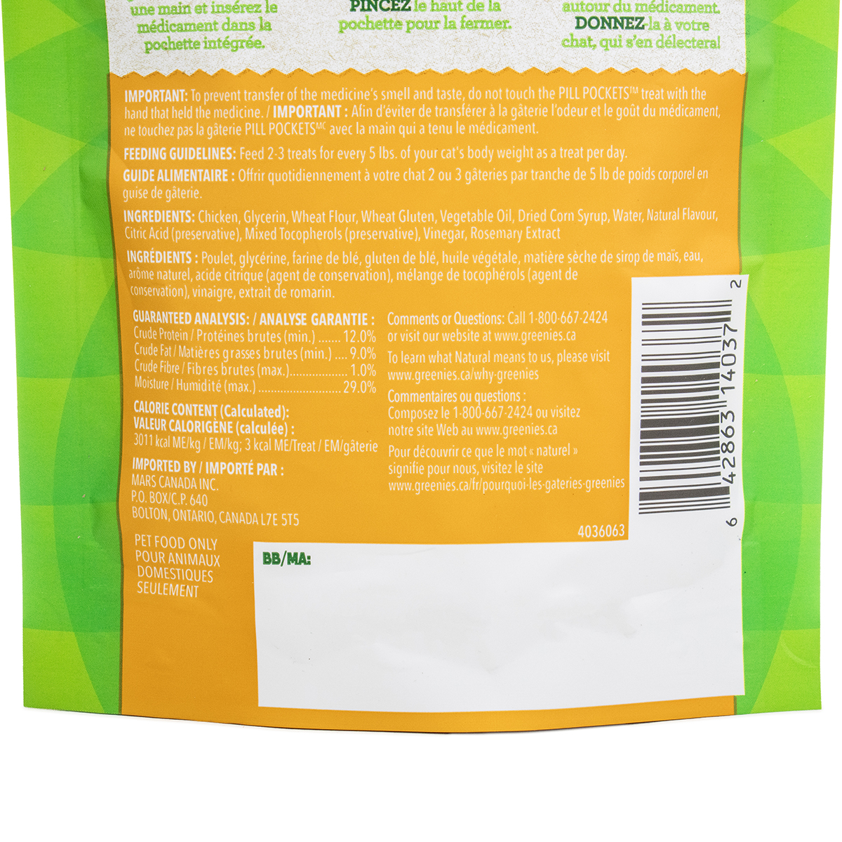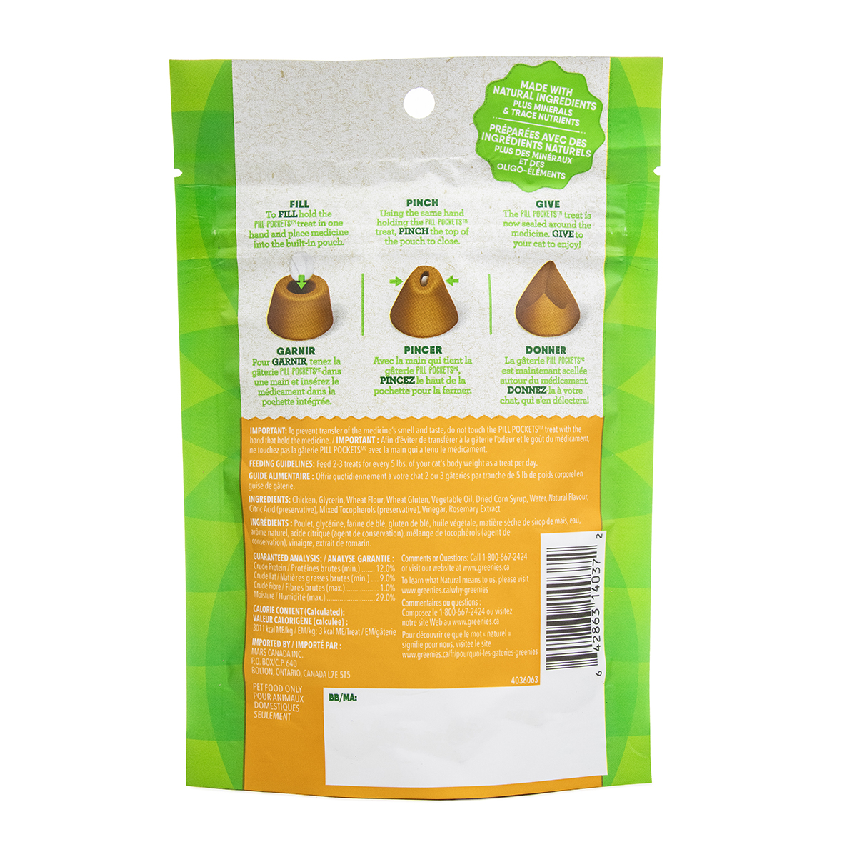 Take the stress and the mess out of giving your cat medicine! FELINE GREENIES™ PILL POCKETS™ Treats have built-in pouches to easily hide tablets or capsules and ensure your cat takes their medication. Made with Natural Ingredients plus minerals and trace nutrients, PILL POCKETS™ are a healthy alternative to using human food to disguise your kitty’s meds. Just drop your cat’s medication into the pouch, pinch it closed, and share with your cat. Just like that, the treat (and medicine) disappears. Your cat is smart, but you’re smarter…Turn Pill Time into Treat Time! Ingredients: Chicken, Glycerin, Wheat Flour, Wheat Gluten, Vegetable Oil, Dried Corn Syrup, Water, Natural Flavor, Citric Acid (preservative), Mixed Tocopherols (preservative), Vinegar, Rosemary Extract Nutrition: Crude Protein (Min.)11.00% Crude Fat (Min.)9.5% Crude Fiber (Max.)1.0% Moisture (Max.)31.0% Calorie Content: 3038 kcal ME/kg 3 kcal ME/treat