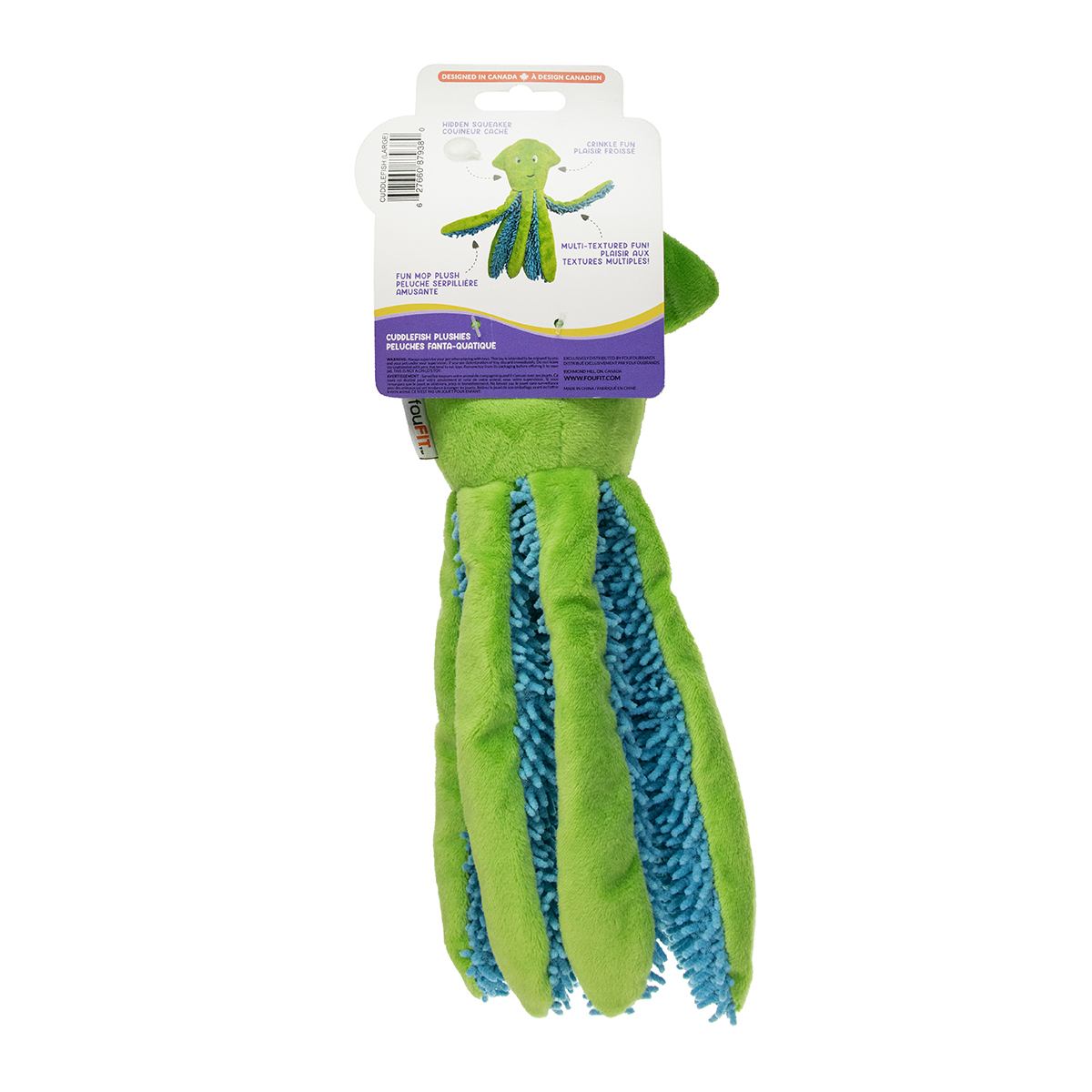Have a dog that loves to cuddle? Well they’re going to love our new CUDDLEfish Plushie toy! I mean, “cuddle” is in the name! Made with a mixture of plush and a soft mop fabric, this multi-sensory plush toy is sure to please. A hidden squeaker and crinkle sounds add extra engagement. Cuddle, toss, or tug on the long floppy legs! Great for puppies to medium size breeds.