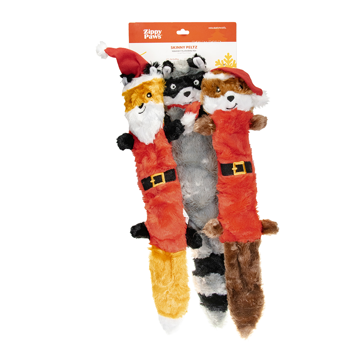 Featuring festive versions of our classic Skinny Peltz, this adorable trio of Holiday Skinny Peltz critters are dressed up ready to celebrate the holiday season! Set includes a fox donning a red outfit and cap, a raccoon sporting a red scarf, and a squirrel rocking a red suit and cap! Great stocking stuffer for pups - naughty or nice! -ZippyPaws Skinny Peltz are no-stuffing plush dog toys that provide hours of squeaking fun! -This set includes 3 large toys (1 of each: Santa Fox, Raccoon, and Elf Squirrel). -Each toy includes 3 round squeakers. -Each toy size: 19in x 2.5in x 0.5in each